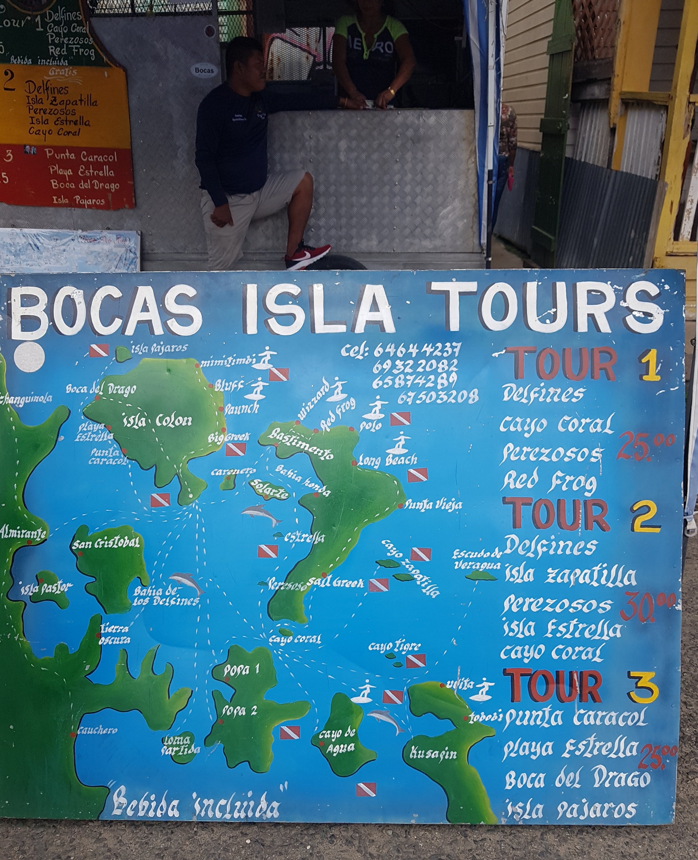 V Bocas sme tak zahájili oslovovanie miestnych agentúry a týpkov čo oslovujú turistov. Šli sme im naproti a začali ich oslovovať, dožadovali sme sa cesty na Isla Escudo Verauguas. Veľa z nich nevedelo kde to je, alebo sa na ostrov báli vyraziť pretože veľké vlny, otvorený oceán, potrebujú 2 kapitánov, niekoho kto to tam pozná a hromada výhovoriek. Je to daleko a pripravte sa na 2 hodiny náročnej cesty. Nakoniec sa nám to podarilo a dohodli sme sa človekom ktorí sedel v budove Expreso Taxi 25.