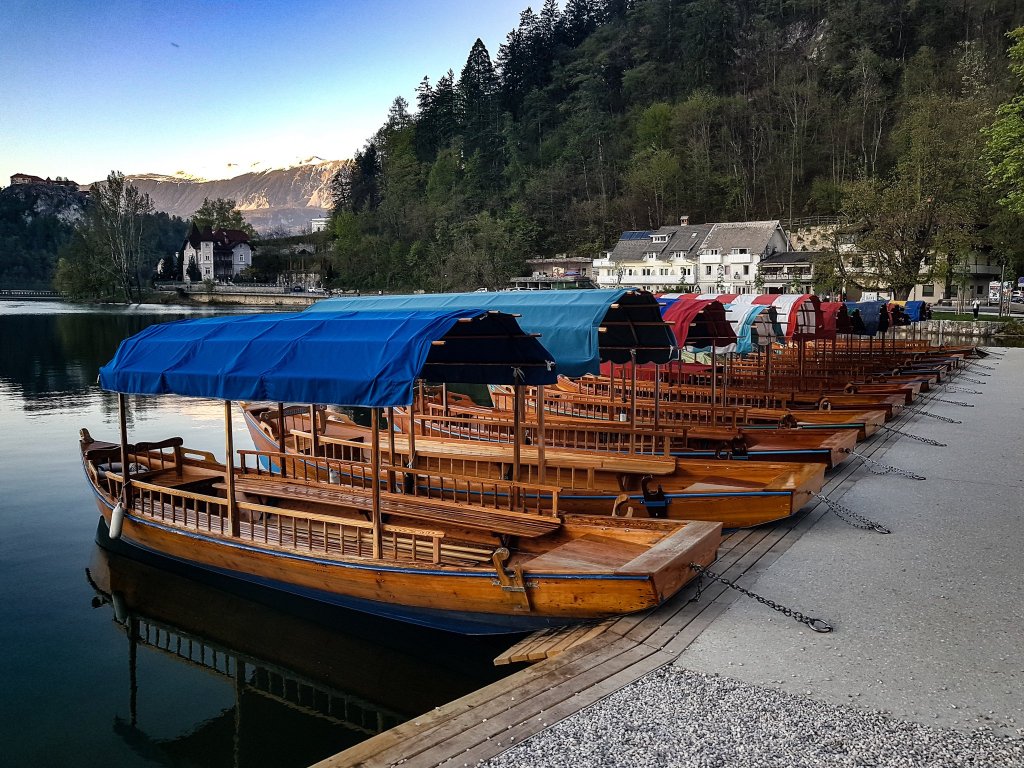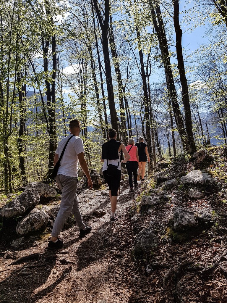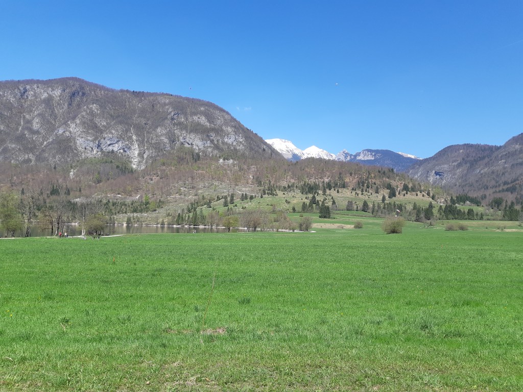 Z restaurace jsme se vydali doleva k jezeru. Na to že byl 20. duben, bylo poměrně dost teplo. Svižné tempo, teplo, málo vody, v nohách procházka ze včerejšího dne, to vše vedlo k tomu, že náš ambiciózní plán obejít celé jezero vzal za své, když jsme asi po hodině chůze uviděli na jezeru výletní loď. Rozhodnutí bylo téměř jednohlasné a okamžité. Zpátky jedeme lodí. Za asi hodinu a půl chůze jsme došli do kempu Zlatorog Bohinj, kde jsme si při čekání na loď oddychli a občerstvili se. Nakonec jsme byla ráda, že jsme změnili plán a zamířili na panoramatickou loď, protože jsme si užili výhled z lodě a díky průvodci jsme se dozvěděli zajímavosti o jezeře i přilehlém městečku Ribčev Laz, do kterého jsme mířili. Jezero je 4 km dlouhé, kilometr široké, místy až 45m hluboké. Je obklopeno Triglavským národním parkem a voda v něm je z místních ledovců a přitéká z nedalekého vodopádu Savica, kam můžete také zamířit.