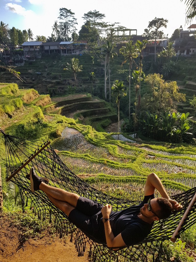 - Do ryžového poľa Tegalalang sme sa dostali na konci mesta, kde sme zastali motorkou a začali v poli blúdiť. Na prvý pohľad to vypadalo neprípustne, ale časom zistíte, že celé pole je posypané cestičkami, po ktorých chodia turisti, farmári, ľudia sa tu fotia alebo len tak prechádzajú. Dávajte si pozor, na čas. Strávili sme tu asi 2 hodiny a človek sa tu ľahko stratí. Má to niekoľko východov, miestne zip-lines, bali swings (hojdačky).