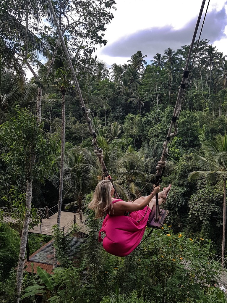- Prvá cesta skptrom viedla na ryžové terasy Tegalalang. Na tomto mieste zaparkujete skúter a pokiaľ chcete, stráite tu celé odpoludnie. Na mieste sa môžete vyfotiť na krásnej hojdačke s výhľadom do džungle. Toto miesto sa presne volá Uma Dalek. Osobne sme videli desiatky podobných miest po celom ostrove, toto bolo jedno z najkrajších a zároveň tu bola fakt nádherná atmosféra. Toto je miesto, kde si môžete spraviť desiatky nádherných fotiek, ochutnať kávu, čaj s tuctom príchutí (zázvor, vanilka, kardamom, škorica, čokoláda…) Asi po hodine, sme si dali naproti Uma Dalek obed v „Sati Sari“, s živou hudbou, krásnym prostredím a perfektnou domácou kuchyňou ako je Soto ayam, Bubur ayam alebo Nasi goreng so zeleným čajom.