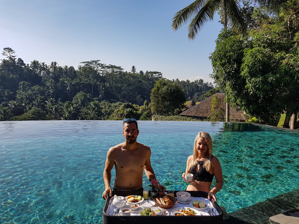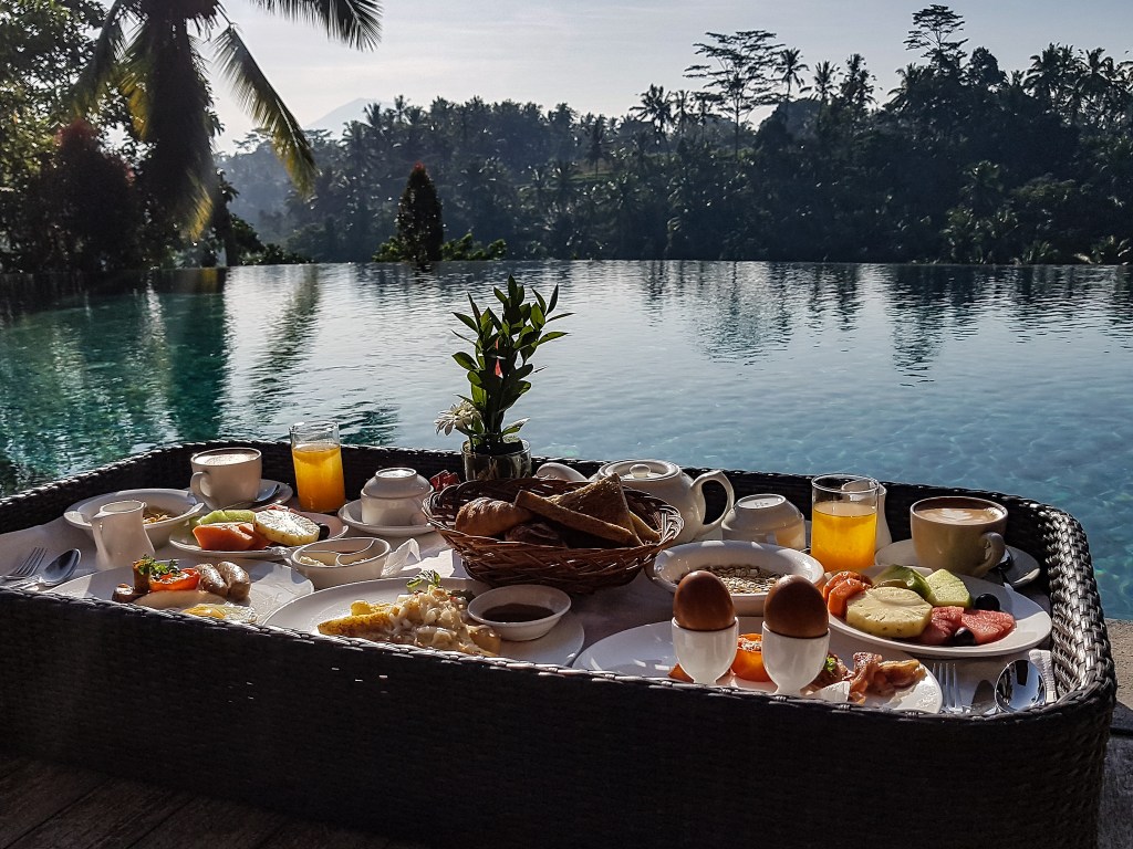 - Tento deň sme začali úžasnými raňajkami, na takzvanej plávajúcel loďke, alebo po anglicky, „floating boat“. Určite ste videli hromadu fotiek z Bali ako si ľudia na Bali užívajú luxusné raňajky v bazéne na podnose. Raňajky na takzvanej Floating boat nájdete aj v rezorte Jannata kde sme bývali.
