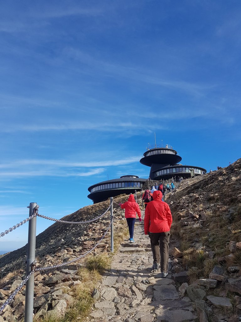 Závěrečné stoupání na vrchol byl pro všechny z nás asi tou nejnáročnější částí cesty. Velké převýšení a silný vítr nám dali zabrat. Jelikož jsme byli na Sněžce poprvé, doufali jsme, že se nahoře odměníme nejen výhledem, ale i teplým čajem nebo nějakým jídlem. Avšak nahoře bylo pouze jedno malé bistro, které bylo narvané k prasknutí. Výhled byl sice hezký, ale vítr byl natolik silný, že jsme se rozhodli zamířit zpátky do Slezského domu. Nešli jsme zpátky stejnou cestou po schodech, ale vzali jsme to byť delší, ale příjemnější cestou po vrstevnici.